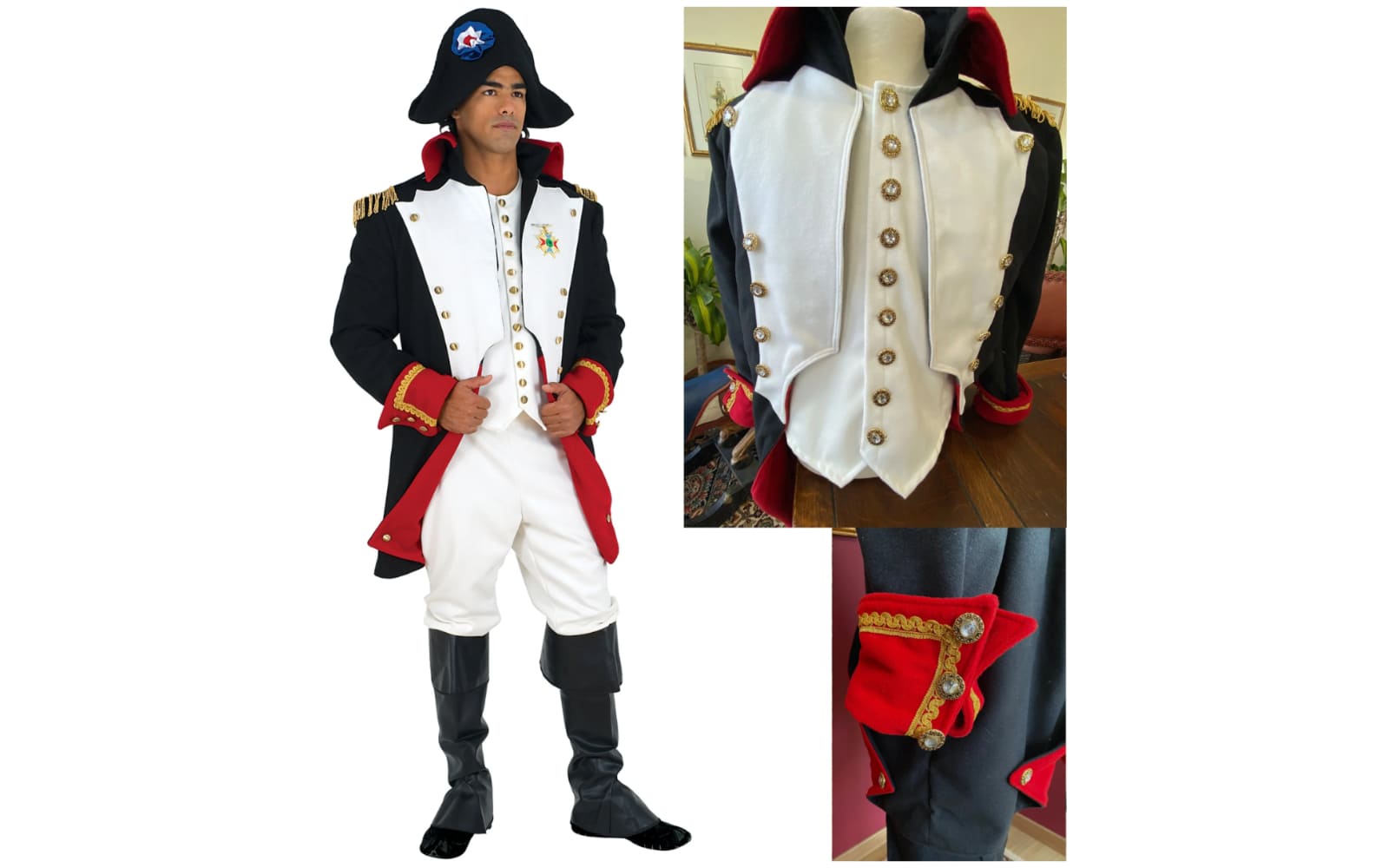 Most complete sets from the Napoleon Costumes line include the iconic blue tailcoat with red facings, a white decorative vest, matching trousers, a ceremonial chest sash, and essential accessories like boot tops and the signature bicorne hat.